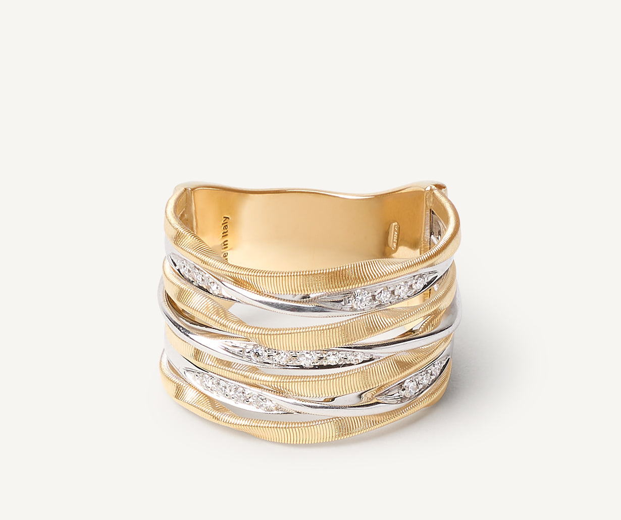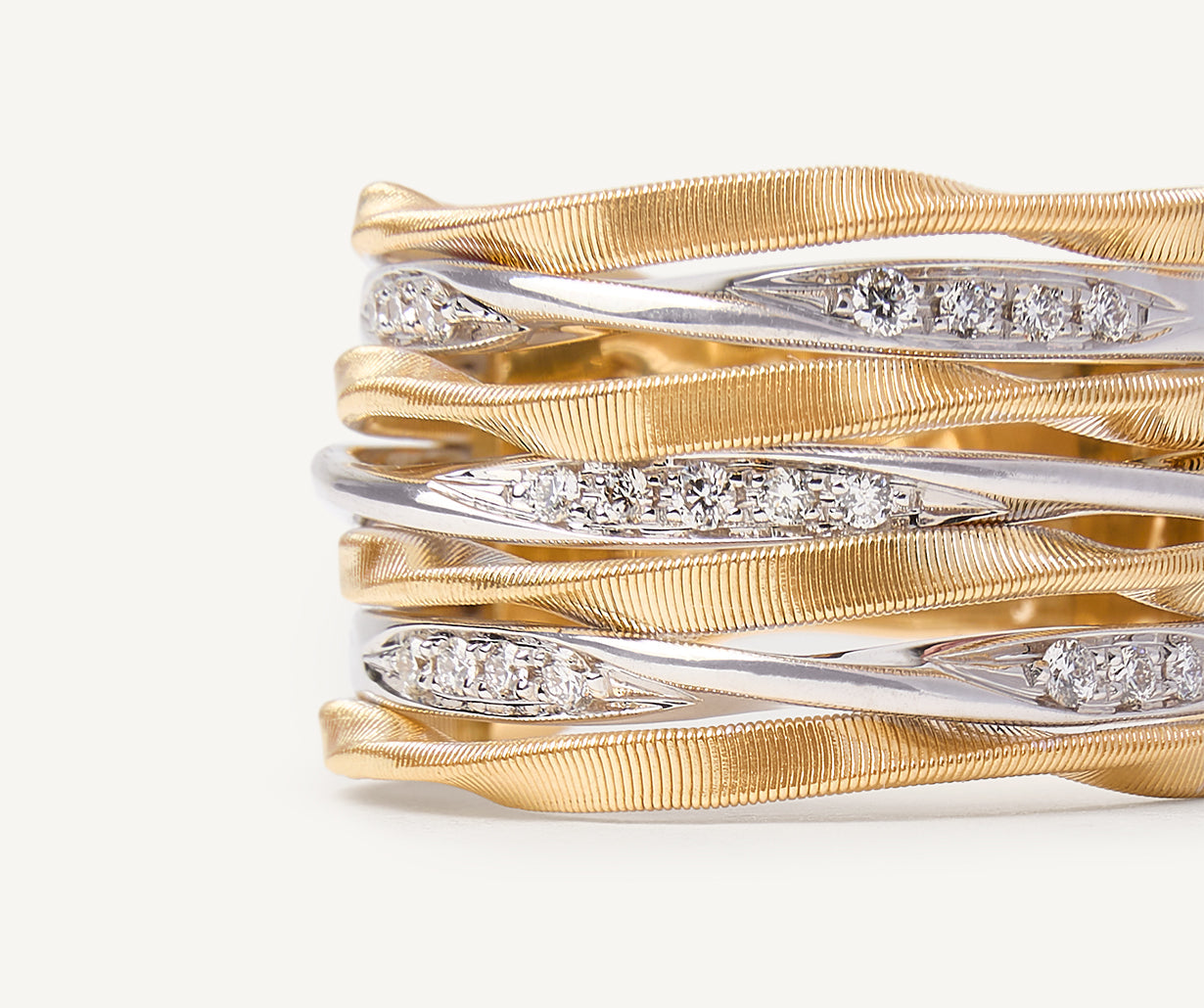 The refined design of the 18kt yellow gold ring makes it a precious accessory to wear every day. Seven bands of twisted threads, carefully created with the exclusive coil technique, alternate with strands featuring brilliant-cut diamond pav, creating a mesmerizing combination of textures and colours.