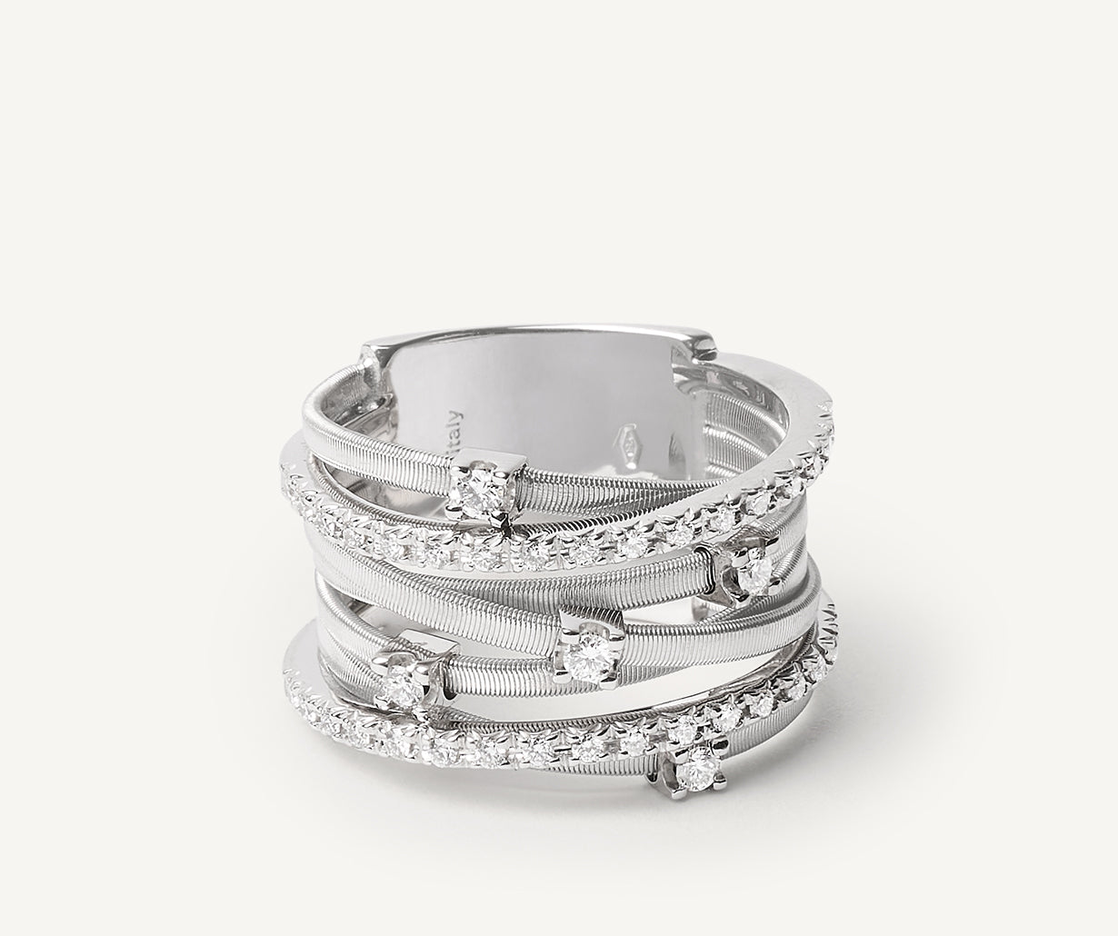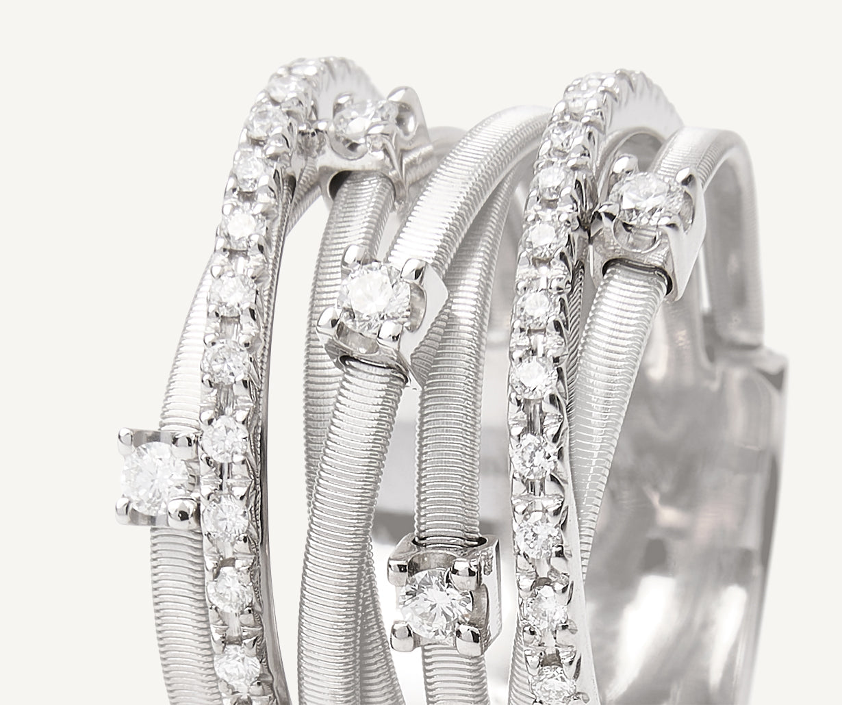 A truly iconic jewel, this stunning 18kt white gold ring is an interplay of flat spiral threads, carefully created with the exclusive coil technique, and plaques studded with brilliant-cut diamonds. The ring is a true must-have, enhanced by a sprinkling of prong-set diamonds.