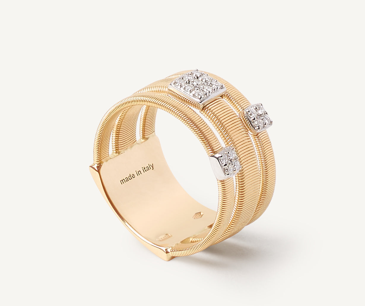 The 18kt yellow gold ring is the epitome of contemporary elegance: three parallel flat spiral threads, carefully created with the exclusive coil technique, are embellished by three brilliant-cut diamond pavs.