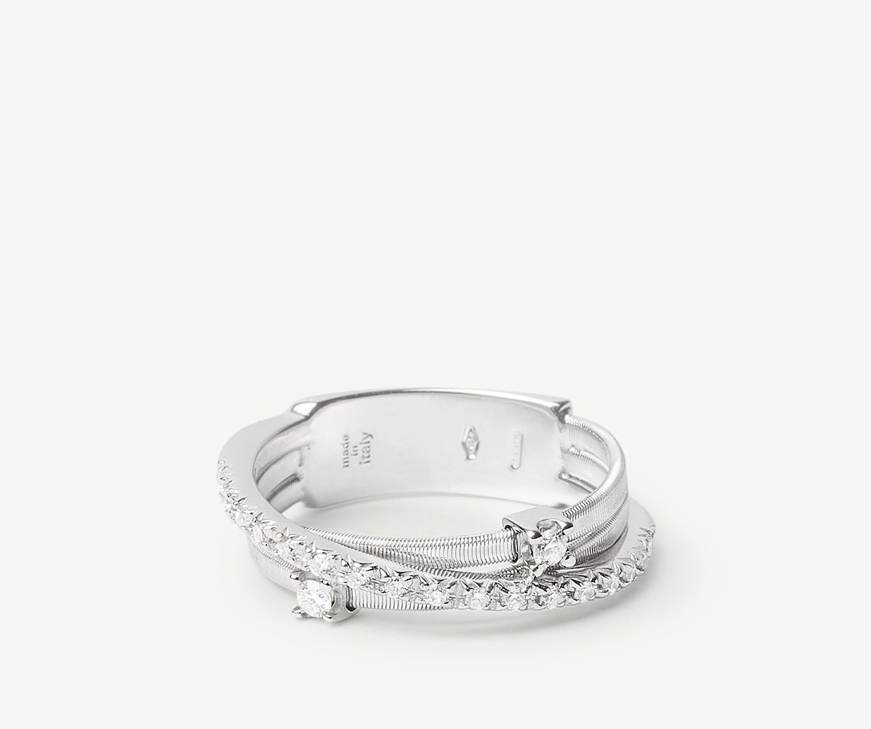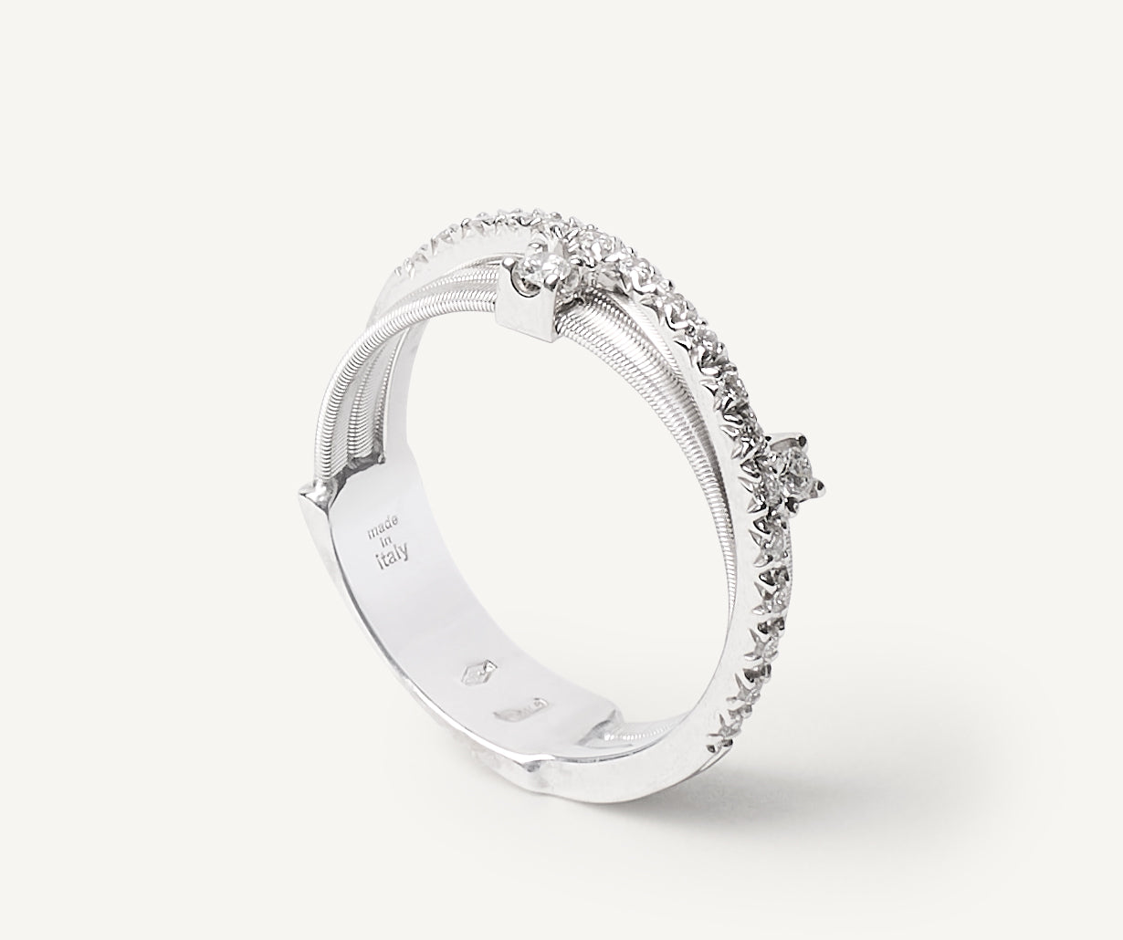 An elegant 18kt white gold ring, it features intertwining flat spiral threads, carefully created with the exclusive coil technique. The iconic design is embellished by two prong-set diamonds and a sophisticated plaque of brilliant-cut diamonds.