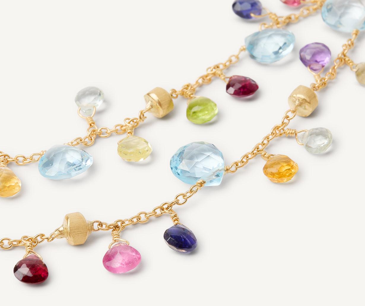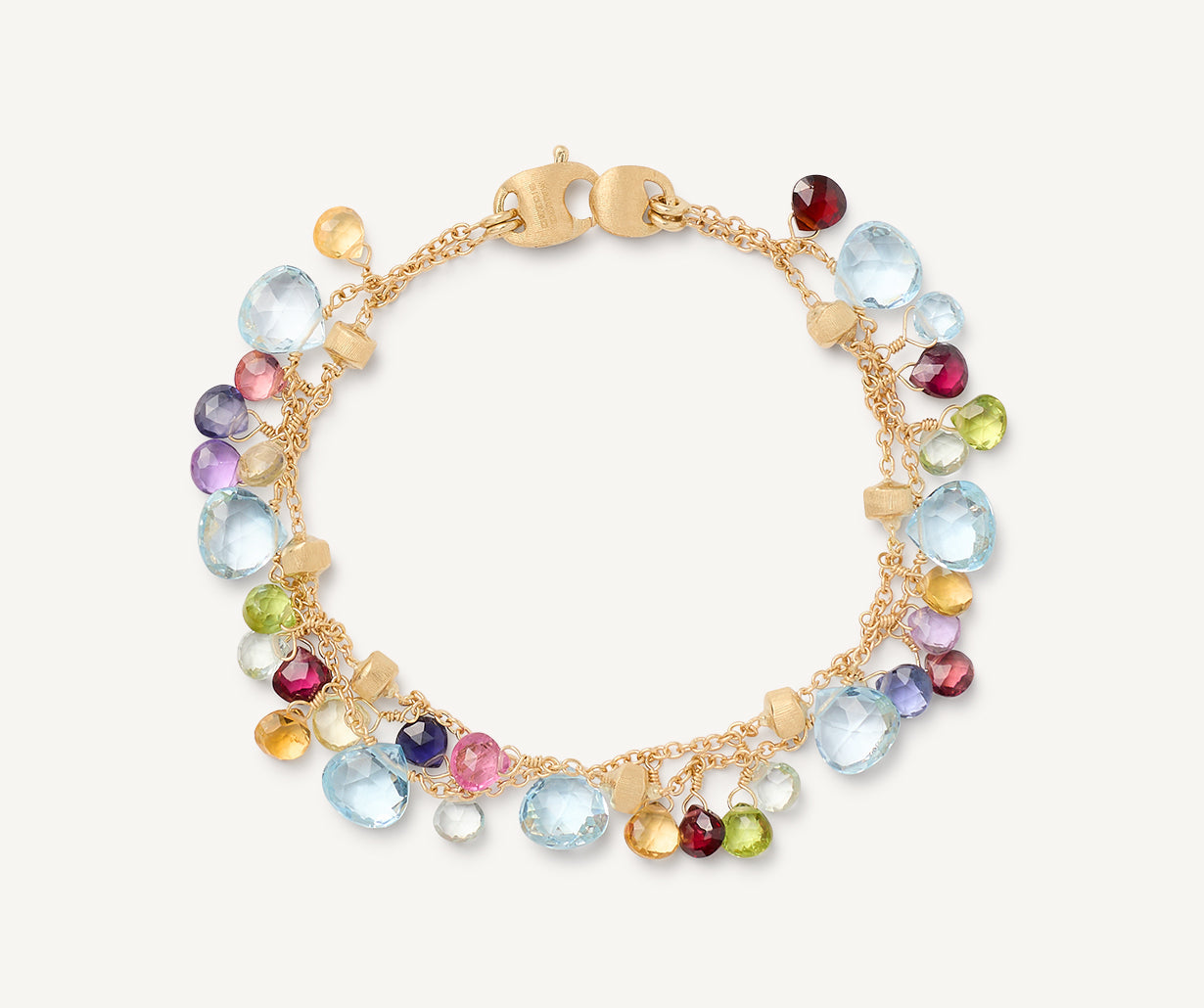 This beautiful multi-strand bracelet stands out for its vibrant colour combinations, with multicoloured heart-cut gemstones featuring alongside elegantly pure sky topazes. The 18kt yellow gold nuggets are finely hand-engraved using an ancient Florentine technique.