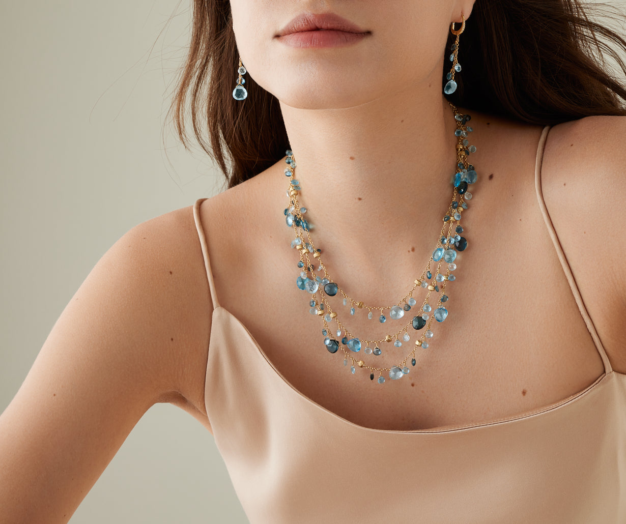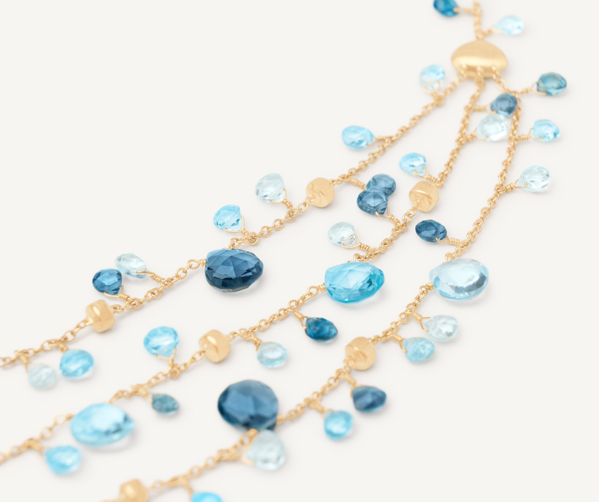 Vibrant and dynamic, this multi-strand necklace features a cascade of carefully selected heart-cut topazes. The 18K yellow gold nuggets are finely hand-engraved using the ancient Florentine technique. Adjustable chain.