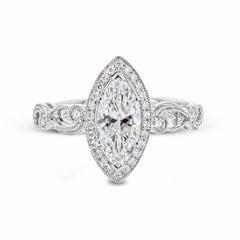 This classic halo engagement ring features a distinctive design adorned with sparkling white diamonds.