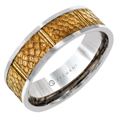 This mens band features a bold hammered gold inlay framed by sleek white metal edges. The contrast between the rugged texture and polished borders creates a striking, contemporary look.