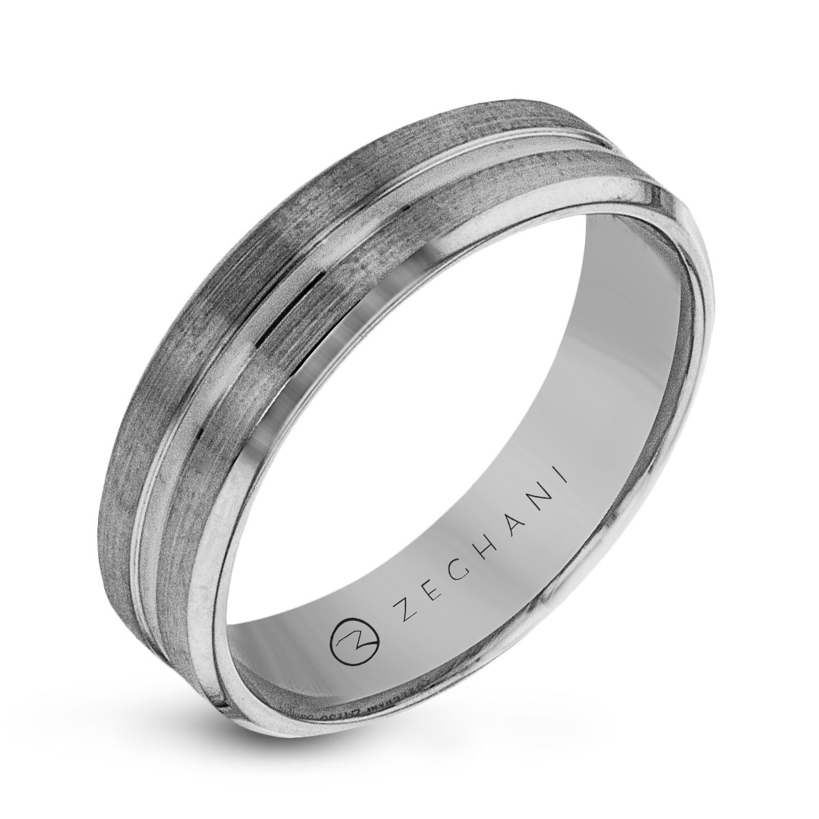 This mens wedding band features a brushed matte center framed by polished beveled edges, creating a refined yet modern look. Its sleek design offers timeless sophistication with a subtle contrast in finishes.