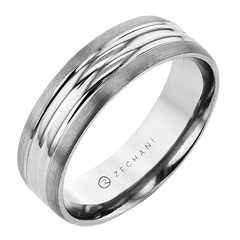 This ring features a brushed white metal finish accented with polished diagonal grooves for added texture. Its sleek design offers a modern twist on a classic band style.