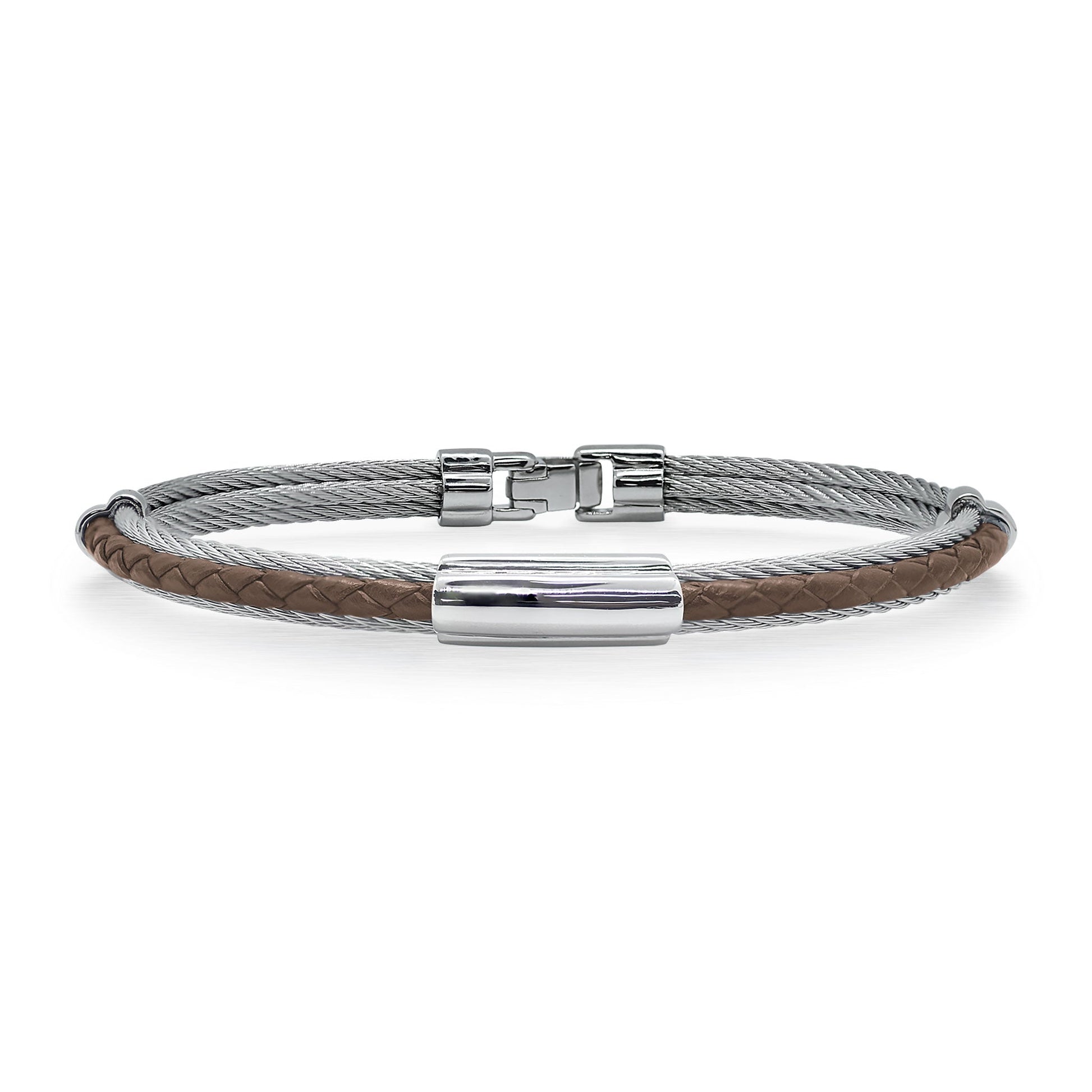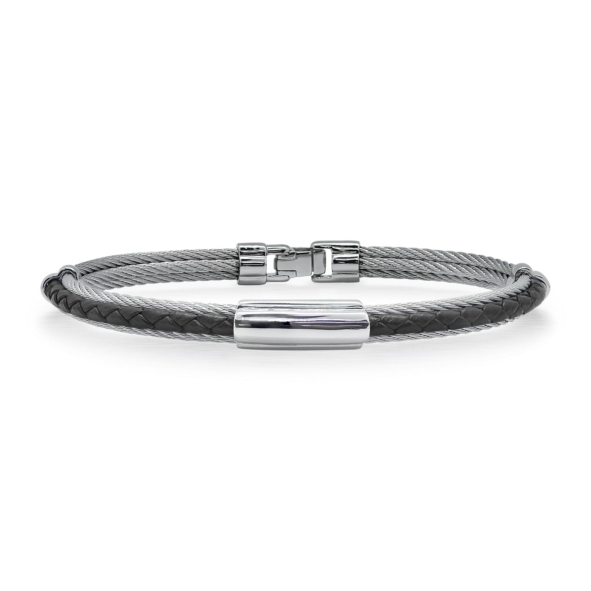 A braided leather and cable bracelet with a gold and steel center station. Imported.