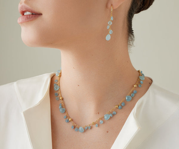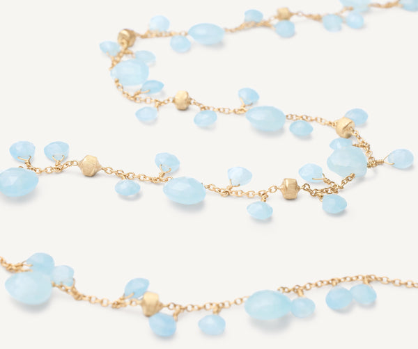 Delicate and elegant, this single-strand necklace features a sequence of heart-cut milky aquamarines alternating with precious 18K yellow gold small nuggets, finely hand-engraved using the ancient Florentine technique.