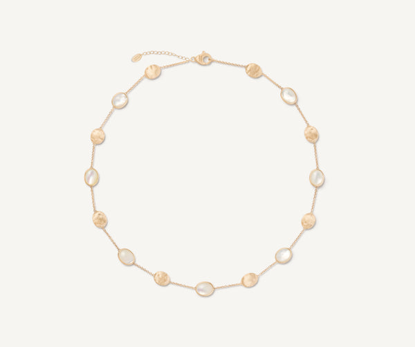 An elegant 18kt yellow gold necklace adorned with medium-sized oval elements finely hand-engraved using the ancient Florentine technique, alternated with carefully selected white mother-of-pearls. Adjustable chain.