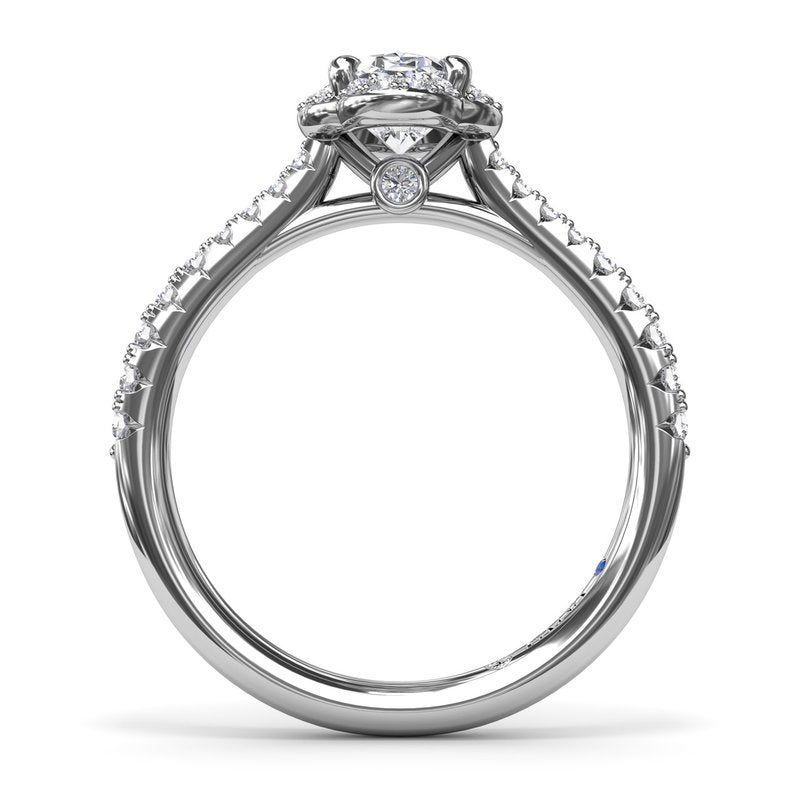 This blossoming halo diamond engagement ring brings femininity to a new level. This design can be customized based on stone shape and metal preference.