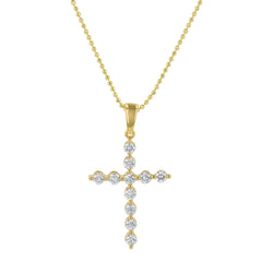14K yellow gold shared prongs cross pendant set with 0.50 carat round brilliant diamonds. Chain sold separately.