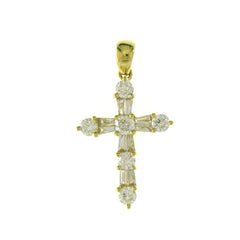 This Pendant is available in 14K Yellow Gold. There are a total of 16 stones. There are Rounds with a total carat weight of 0.37 set in a Channel Set|Prong Set setting.There are Tapered Baguettes stones with a total carat weight of 0.22 set in a Channel Set|Prong Set.