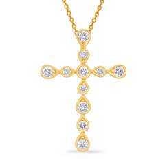 This Pendant is available in 14K Yellow Gold. There are a total of 11 stones. There are Rounds with a total carat weight of 0.5 set in a Prong Set setting.