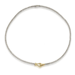 This timeless necklace features a two-tone design adorned with sparkling diamonds.