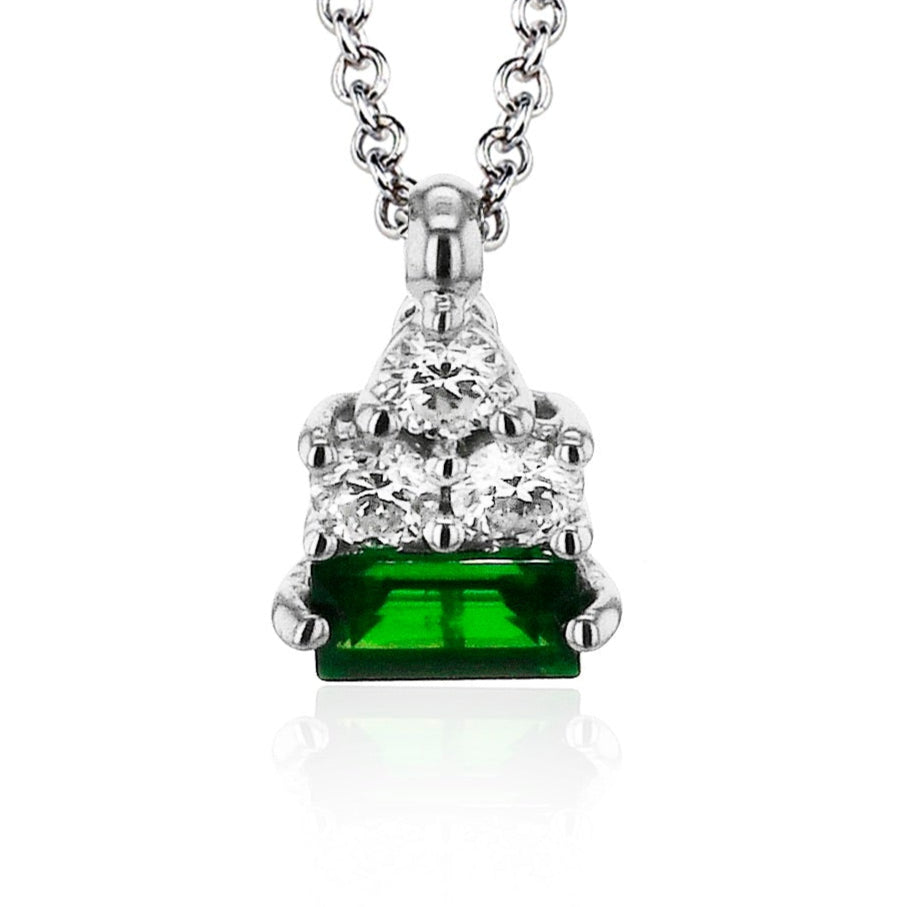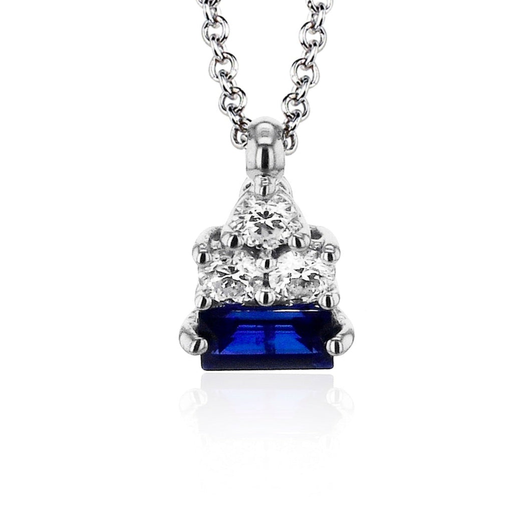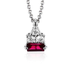 This elegant pendant features a geometric arrangement of sparkling white diamonds above a richly hued baguette-cut ruby. Set in polished white gold and suspended from a delicate chain, it offers a striking blend of modern sophistication and timeless luxury.