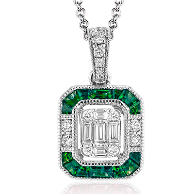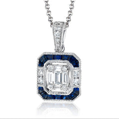 This pendant features an emerald-cut diamond framed by a halo of smaller diamonds and accented with deep blue sapphires at each corner. Its striking contrast of brilliance and color gives it a refined vintage-inspired elegance.