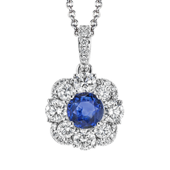 This simple charm 14k white gold pendant with .70ctw of white round diamonds and .61ctw of precious sapphire can be perfectly individualized by its wearer. 14kw .70ctw .61sap