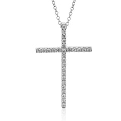 This sleek diamond cross pendant features a minimalist vertical design, lined with sparkling round diamonds for a graceful and modern expression of faith.