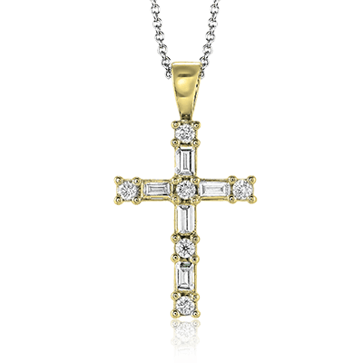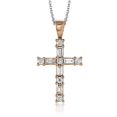 This elegant cross pendant showcases a refined blend of round and baguette-cut diamonds set in a warm rose gold frame. Timeless and meaningful, it offers a radiant symbol of faith with a modern, luxurious twist.