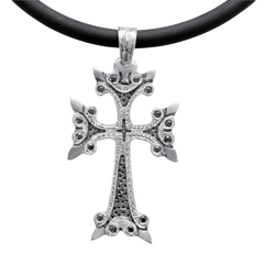 This pendant showcases a bold cross design crafted in silver, featuring intricate texturing and ornate detailing at each end for a striking look. Hung on a black cord, it blends traditional craftsmanship with a modern, edgy style.