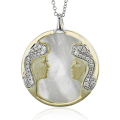 This pendant features the Gemini zodiac sign with two golden figures facing each other, their hair accented by sparkling diamonds, all set in a luminous round medallion. Representing those born May 21st – June 20th, it symbolizes duality, curiosity, and lively energy with an elegant touch.