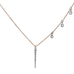This modern necklace features a rose gold chain accented with a sleek, vertical diamond bar pendant and three bezel-set diamond drops arranged asymmetrically along the chain. Its stylish, off-center design adds a contemporary twist to a classic sparkle.
