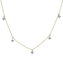 This delicate gold chain necklace features alternating diamond-accented starbursts and floral charms for a whimsical yet elegant look. Perfect for layering or wearing solo for a subtle sparkle.