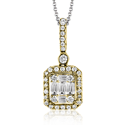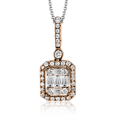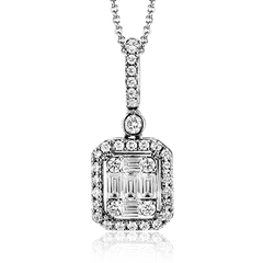 This pendant features a geometric design framed with a halo of shimmering stones for added brilliance. A diamond-accented bail connects it to a delicate chain, creating an elegant and timeless look.
