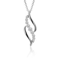 This elegant pendant features a flowing, modern design with a gentle twist of polished white gold framing a row of sparkling round diamonds. Graceful and sophisticated, it adds a refined touch of brilliance to any neckline.