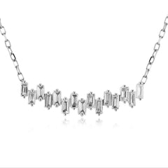 This necklace features a modern bar design with baguette-cut diamonds arranged in a staggered pattern. Its sleek and contemporary style makes it a versatile piece for both casual and formal looks.