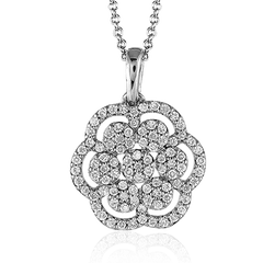 This pendant showcases an intricate floral-inspired design crafted entirely in white metal and encrusted with shimmering round diamonds. The overlapping petal pattern forms a symmetrical, lace-like blossom, radiating elegance and femininity. It's a timeless piece that combines vintage charm with modern sparkle—ideal for special occasions or as a statement everyday accessory.