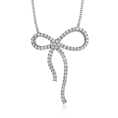 This delicate necklace features a sparkling diamond bow pendant that exudes femininity and charm. The gracefully draped design captures the elegance of a tied ribbon, adding a whimsical yet refined touch to any look.