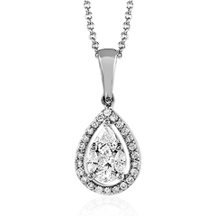 This teardrop-shaped pendant features a cluster of sparkling diamonds surrounded by a diamond halo for maximum brilliance. Available in white, rose, and yellow gold, it’s a timeless design that radiates elegance.