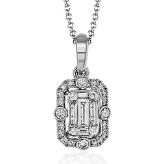 This radiant pendant showcases a cluster of baguette and round diamonds arranged in a vintage-inspired rectangular frame. Suspended from a classic white gold chain, it exudes timeless elegance with intricate sparkle and refined detail.