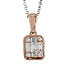 This sophisticated pendant showcases a geometric arrangement of baguette and round diamonds, framed in a warm rose gold bezel for a vintage-inspired charm. Suspended from a delicate chain, it blends modern elegance with timeless sparkle.