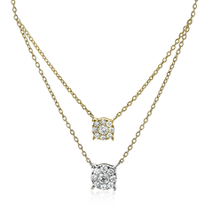 This lovely necklace features a double pendant design with a cluster of sparkling diamonds paired with a shimmering diamond center.