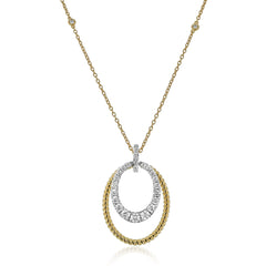 This pendant features two stacked rings - one with a unique ribbed texture and the other adorned with shimmering diamonds.