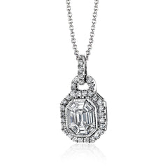 This beautiful pendant contains a center mosaic of brilliant baguette diamonds surrounded by sparkling round diamonds.
