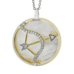 This pendant showcases the Sagittarius zodiac sign with a golden bow and arrow, accented by shimmering diamonds along the curve, set within a radiant round medallion. Representing those born November 22nd – December 21st, it symbolizes adventure, optimism, and free spirit with an elegant sparkle.