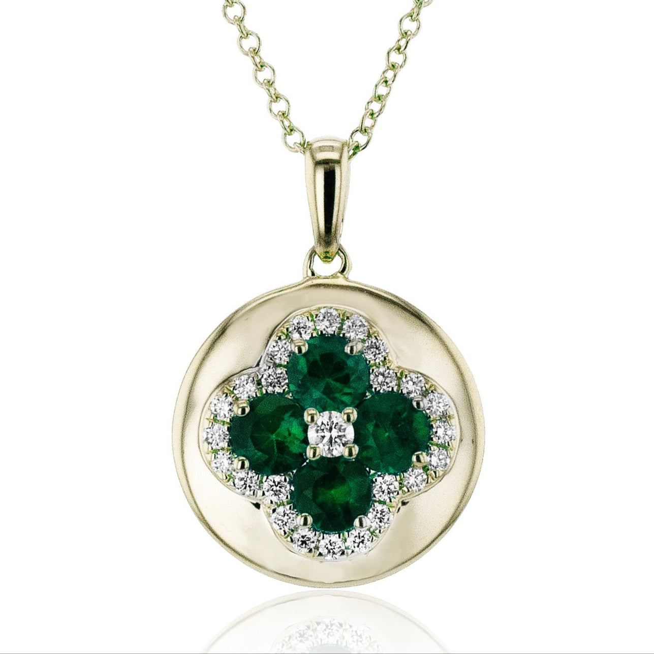 This pendant features a round medallion design with a clover-shaped arrangement of sapphires accented by a sparkling diamond center and halo. Its elegant symmetry and rich color contrast make it a timeless and versatile piece.