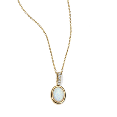 This elegant pendant pairs 5 glittering diamonds (0.05 ct) with a single iridescent opal weighing 0.54 ct. A graceful design that radiates subtle sophistication.
