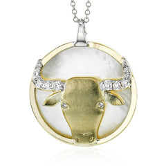 This pendant showcases the Taurus zodiac sign with a golden bull’s head, its horns accented by sparkling diamonds, framed in a radiant round medallion. Representing those born April 20th – May 20th, it symbolizes strength, stability, and determination with a touch of elegance.