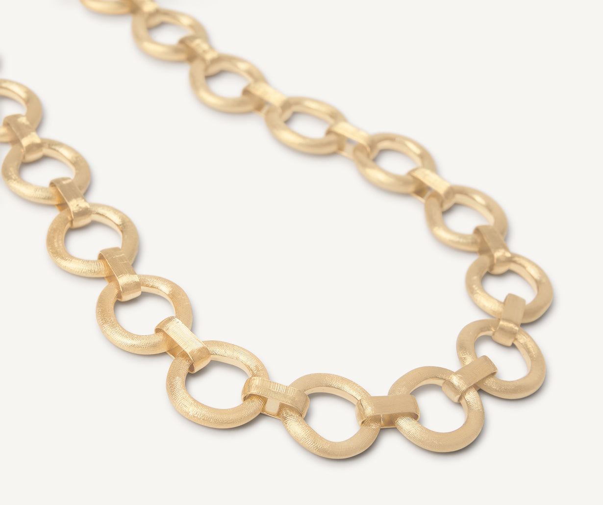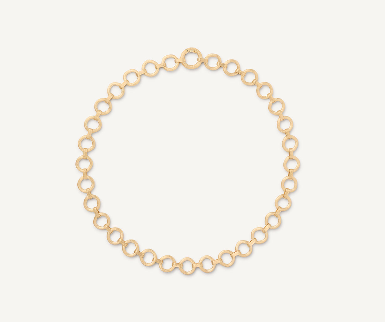 This 18kt yellow gold link collar necklace is finely engraved by hand with an ancient Florentine technique. It is ideal styled with the different stackable pendants of the Jaipur collection.