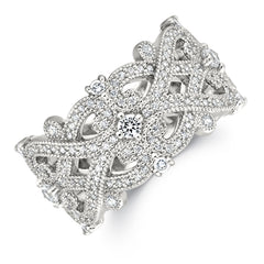 Interweaving knot patterns, highlighted by central diamond tying the whole piece together. Intricate milgrain designs adds additional contrast to the piece.