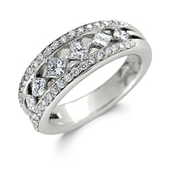 Princess cut diamonds set point to point, suspended between two rows of small white diamonds. Soft rounded wire contrasts with diamonds set between the walls.