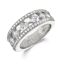 Princess cut diamonds set point to point, suspended between two rows of small white diamonds. Soft rounded wire contrasts with diamonds set between the walls.