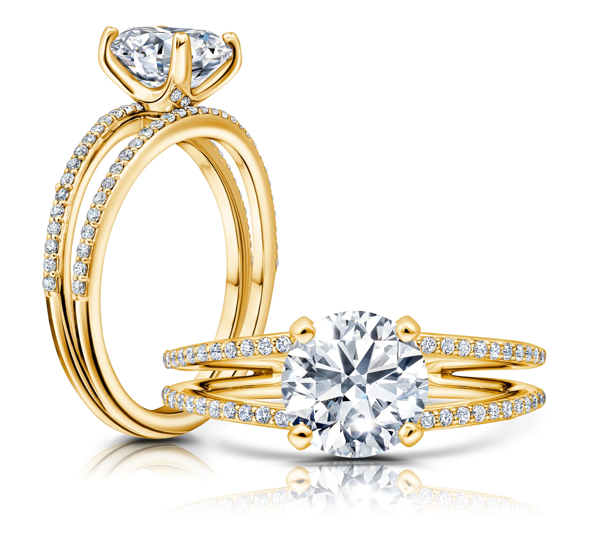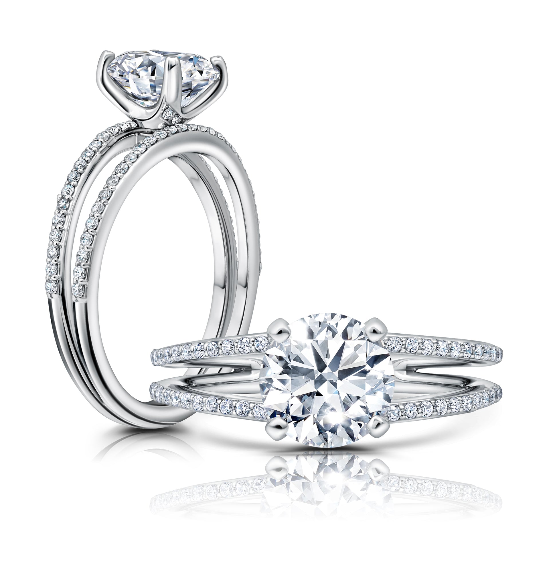 A rounded split shank combined with a cub head. Great for round, oval, and emerald cut center stones.