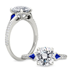 Blue sapphire kites site on each side of the center. Two rows of diamonds on the band. One of Peters favorite rings. Comes in diamond.