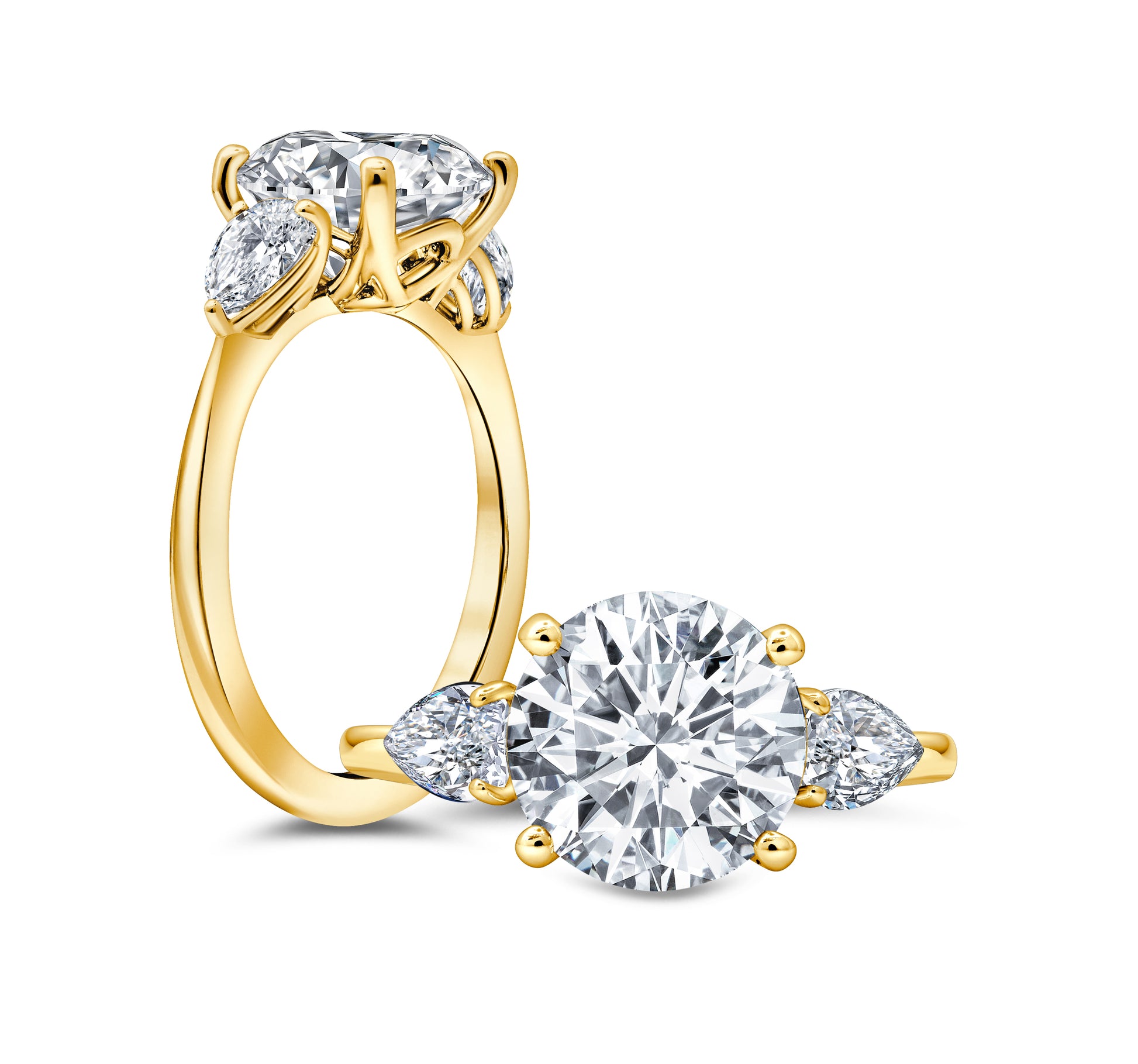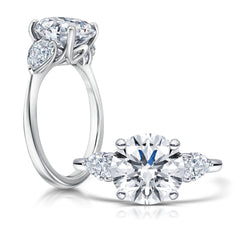 Peter adds a modern flair to this cluster three stone ring. A princess cut diamond flanked by two round stones makes a unique and modern pairing for your chosen center,
