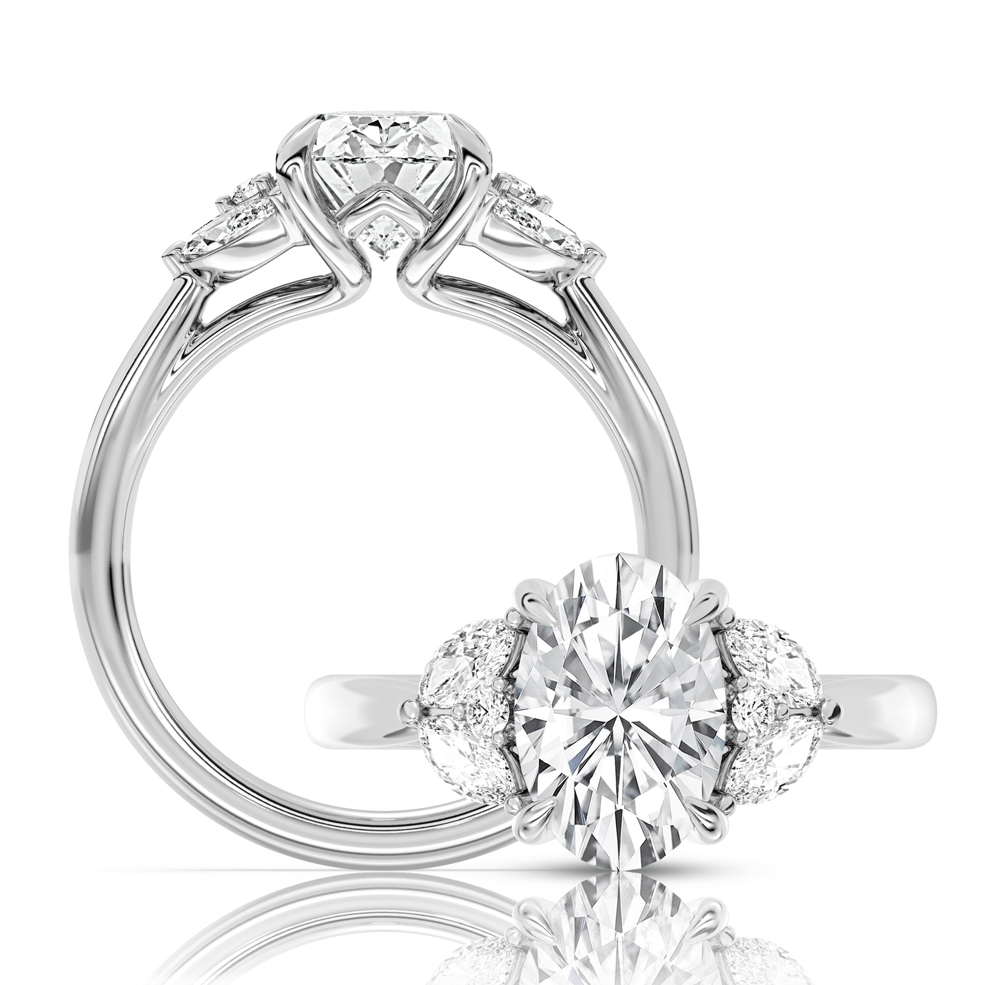 Peter adds a modern flair to this cluster three stone ring. Two marquis diamonds create a V with a round diamond at the center. Available for all center stone shapes and sizes.
